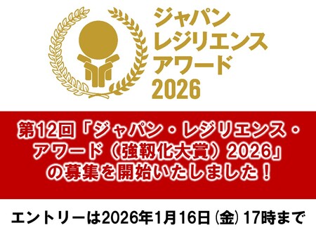 一般社団法人レジリエンスジャパン推進協議会(所在地:東京都千代田区、会長:広瀬道明 東京ガス相談役) は、第12回目となる「ジャパン・レジリエンス・アワード(強靱化大賞)2026」のエントリーを2026年1月16日(金)17時までの期間で募集いたします。