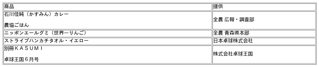 イベントの最後には子どもたちへ石川さんが監修した「石川佳純(かすみん)カレー」などを含む豪華な参加賞と、石川さんのサイン入り修了証を贈呈しました。