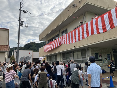 (右)地域の方々でにぎわった餅投げ行事の様子