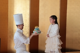 贈呈式では、ホテルパティシエが実現した夢のケーキに加え、表彰状と賞品を贈呈。受賞者のおおぶち こはる様からは「うれしい!自分の絵がえらばれるなんてうそかと思った!最初に星の部分を食べたい。」と、かわいらしい喜びの声をいただきました。保護者の方からは、「第1回目のコンテストから応募を続けていて、本人も“これだけは絶対に叶えたい”と言って諦めずに取り組んでいました。スカイビュッフェ51のスイーツの色やグラデーションが大好きで、パティシエさんが作るケーキをよく観察していて、自分の絵にもそれを取り入れるなど工夫していました、選んでいただいて本当に喜んでいます。」とコメントをいただきました。