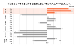 ● 休日の食事は「気分が高まる食事をしたい」「五感を使い心が満たされる食事をしたい」「ワクワク楽しませてくれる食事をしたい」といった“楽しさ”に関する項目が、平日の食事よりも高い傾向にある。休日の朝食は平日に比べて3.2ポイント、昼食は休日3.5ポイント、夕食は1.2ポイント高かった。【図表10】