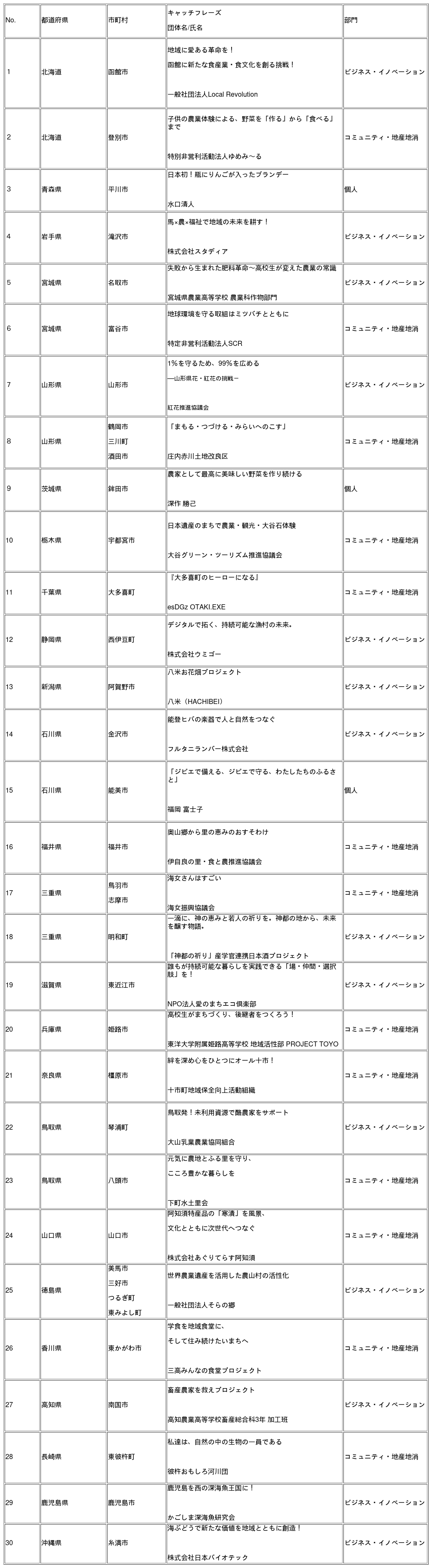 農林水産省及び内閣官房は、「強い農林水産業」、「美しく活力ある農山漁村」の実現に向けて、農山漁村の地域資源を引き出すことにより地域の活性化や所得向上に取り組んでいる優良な事例を選定し、全国へ発信することとしています。