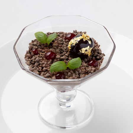 さくらんぼのコンフィチュールになめらかなチョコレートのクリームを重ね、上にはカカオパルプ※のパウダーを練りこんだ酸味のあるチョコレートと甘くビターな粒状のチョコレート2種類を振りかけました。金箔を飾ったアマレナチェリー※とバジルをトッピングしており、バジルによる味わいと香りの変化を楽しめるだけでなく、まるで土からバジルが生えているような見た目にも市川の遊び心が感じられるグラスデザートです。