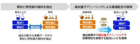 本実証ではまず、住友ゴムの有する過去の実験データから、素材の種類と配合量が材料特性に与える傾向を分析・抽出しました。次に、抽出した本傾向をもとに、膨大かつ複雑な組み合わせの中から高速に最適解を導くことが可能なNECの疑似量子アニーリング技術を活用して、目標とする特性を満たす素材の種類と配合候補を網羅的に探索しました。