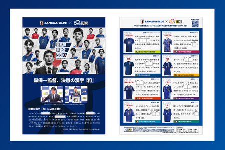 サッカーの知識をヒントに漢字問題を解くことができ、楽しみながら学ぶことができるオリジナル漢字検定です。表面はSAMURAI BLUE(日本代表)の森保一監督が来年2026年に向けてしたためた決意の漢字 『和』に込めた想いを掲載。裏面ではこれまでの歴代ユニフォームに込められた想いを、漢字問題を解きながらふりかえることができます。