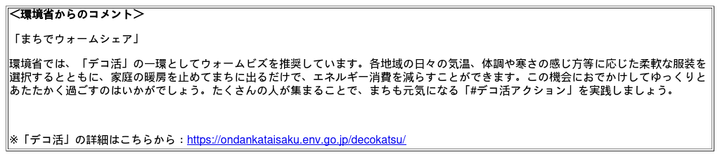 イオンモール株式会社(以下、当社)は、2025年12月1日(月)~2026年2月28日(土)までの期間、環境省地球環境局デコ活応援隊(脱炭素ライフスタイル推進室)と連携し、ウォームシェアを推進する取り組み「イオンモールで温(ぬく)もーる!」を開催します。