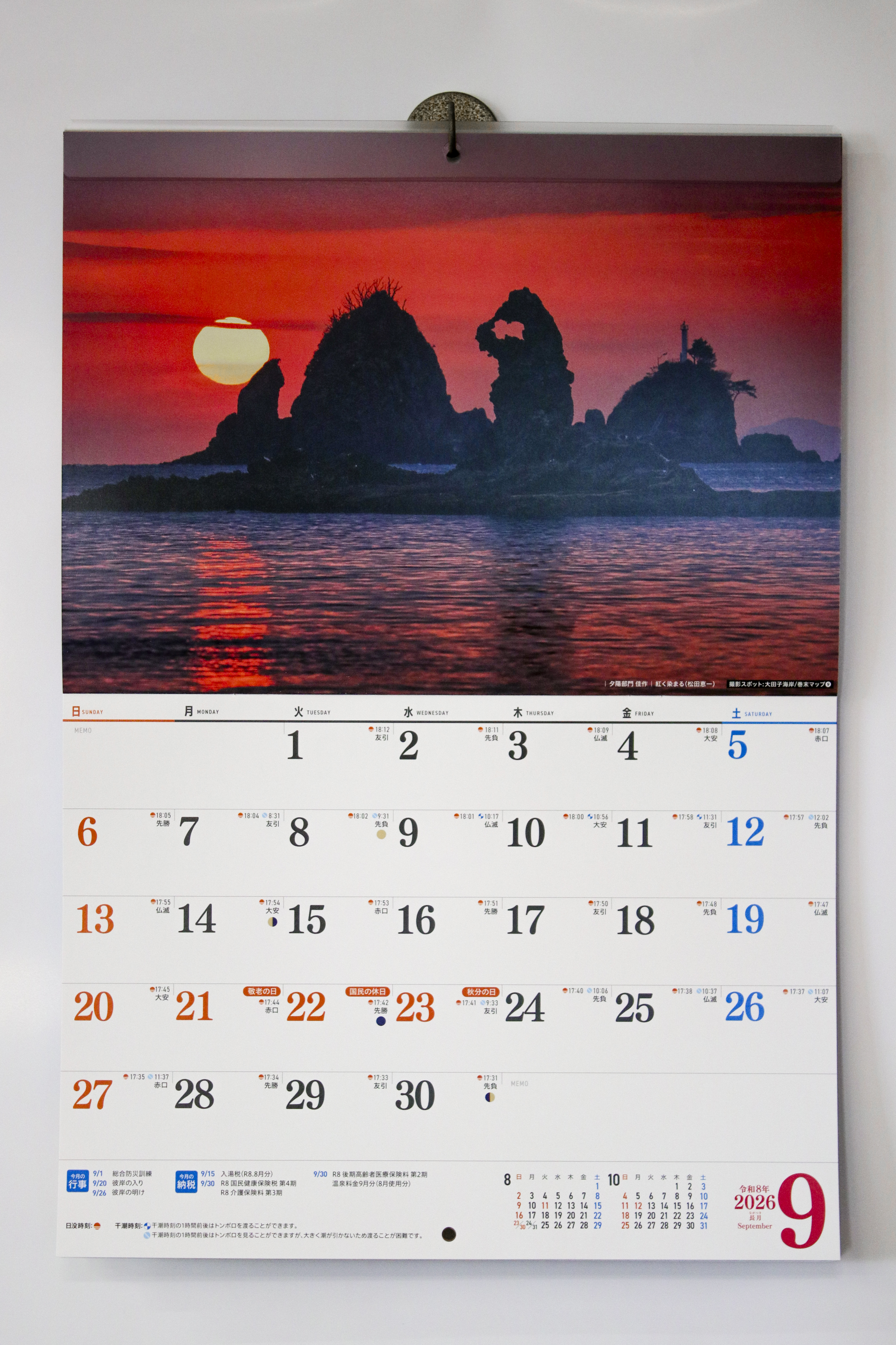 また日付のタマも大きく、見やすく読みやすく、メモ書きしやすい仕様になっています。タマには六曜、祝日、日没時刻・干潮時刻、町内イベント、先月翌月の記載もあります。カレンダーは発色の良さにこだわった印刷で、色鮮やかな写真をふんだんに使用し、高いクオリティを実現。角の折れ曲がりを防ぐ付属品も付いています。