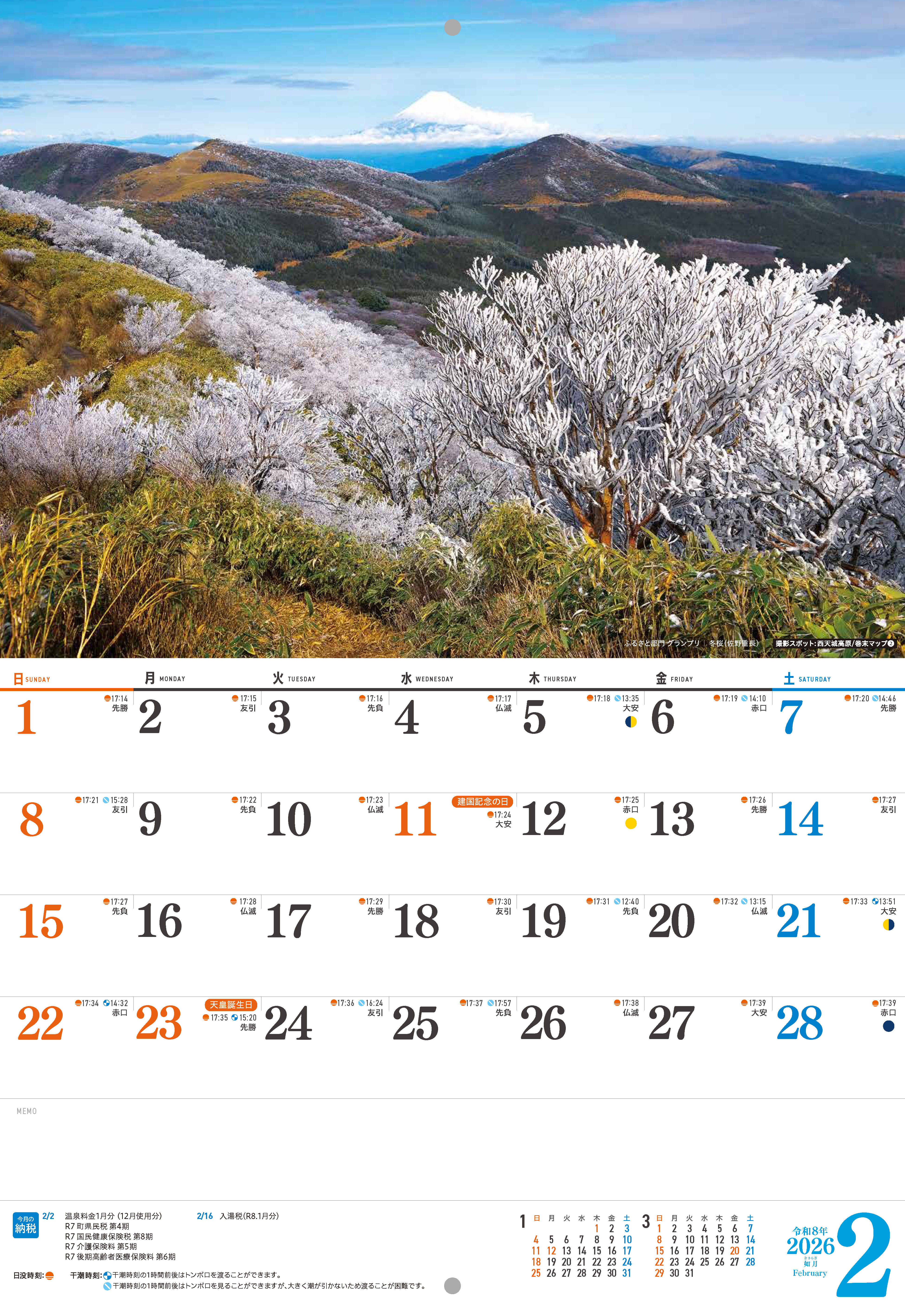 ・六曜、祝日、日没時刻・干潮時刻、町内イベント、先月翌月の記載あり
