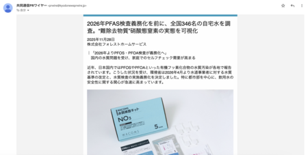 メール件名には先頭に「企業・団体名」、続いて内容がひと目で分かるタイトルを添えて配信することで、個々のプレスリリース情報が認識されやすい設計になっています。