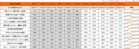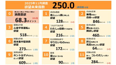 〈2025年11月調査における「欲望未来指数」と「11の欲望」の推移〉()内は前回比増減