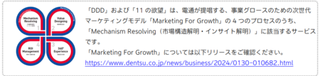 DDDは今後も、人々の消費行動を駆り立てる「欲望」の視点を組み入れた消費者理解を追求し、より深いカスタマージャーニー(顧客の製品・サービスの購入に至るまでの過程)の設計や、PDCAの仕組みづくりなどの支援を通じて、企業のマーケティング活動の高度化・効率化に貢献していきます。