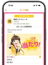 「出席のみ(当たりくじ付き ) 」では、教員が出席カードに当たりくじを設定します。 そして提出と同時に抽選します。 当たった学生は教員の指示に従って課題発表等をします。