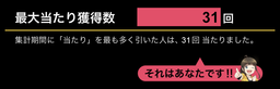 全国でもっとも多く「当たり」を引いた学生は 31回 当たっていました。