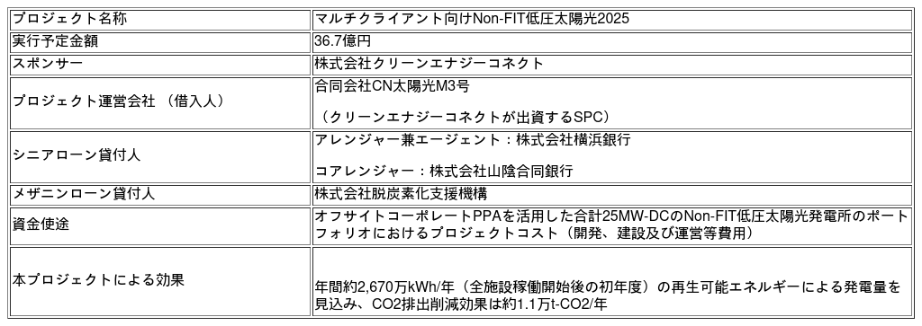 脱炭素経営企業、RE100参加企業等のお客様に対してNon-FIT太陽光発電によるグリーン電力と環境価値をお届けする株式会社クリーンエナジーコネクト(代表取締役:内田鉄平、以下「クリーンエナジーコネクト」)は、オフサイトコーポレートPPAのプロジェクトにおける25MW-DCのNon-FIT低圧太陽光発電所の開発のため、株式会社横浜銀行・株式会社山陰合同銀行、および株式会社脱炭素化支援機構(JICN)から、プロジェクトファイナンスにより総額36.7億円の資金調達を実施したことをお知らせいたします。