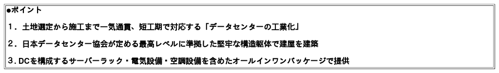 3.DCを構成するサーバーラック・電気設備・空調設備を含めたオールインワンパッケージで提供