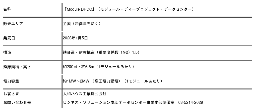 大和ハウス工業株式会社(本社:大阪市、社長:大友 浩嗣)は、創業以来培ってきた工業化建築技術を応用して開発した、モジュール(※1)型データセンター商品「Module DPDC(モジュール・ディープロジェクト・データセンター)」の販売を、2026年1月5日より開始します。