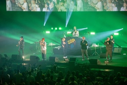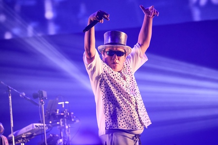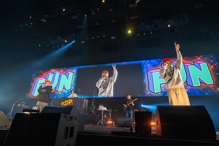 「今日はスチャダラパーの35周年ということで、ラップ中心にやっていこうと思います。まずは"楽園をベイベーに"しようかな」と、「ギガアイシテル」の曲間では、自身のラップパートに加え、リップスライムのヒット曲も取り込むという、レキシのライブならではの"ぶっこみ"も随所に盛り込まれた。「KMTR645」では、レキシライブ定番のイルカの浮き輪が観客席に投げ込まれ、「イルカをぽんぽんして、会場全体に回して、そのまま山下ふ頭に返してあげましょう!」という言葉に笑いと歓声が起きる。