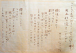 1999(平成11)年5月、筆者は長崎市の永井隆記念館を訪ねました。当時の館長は、被爆者を救った永井隆の長男永井誠一(まこと)で、「ご苦労さまです」と、長旅の労をねぎらってくれました。約50年前に永井隆から古関に送られた手紙の複写をお見せしたところ、誠一はハラハラと涙を流し、重い口を開いて当時の様子を語ってくれました。その時、陳列戸棚に展示してあったのが、今回の写真の詩「ああ此の涙をいかにせん」でした。